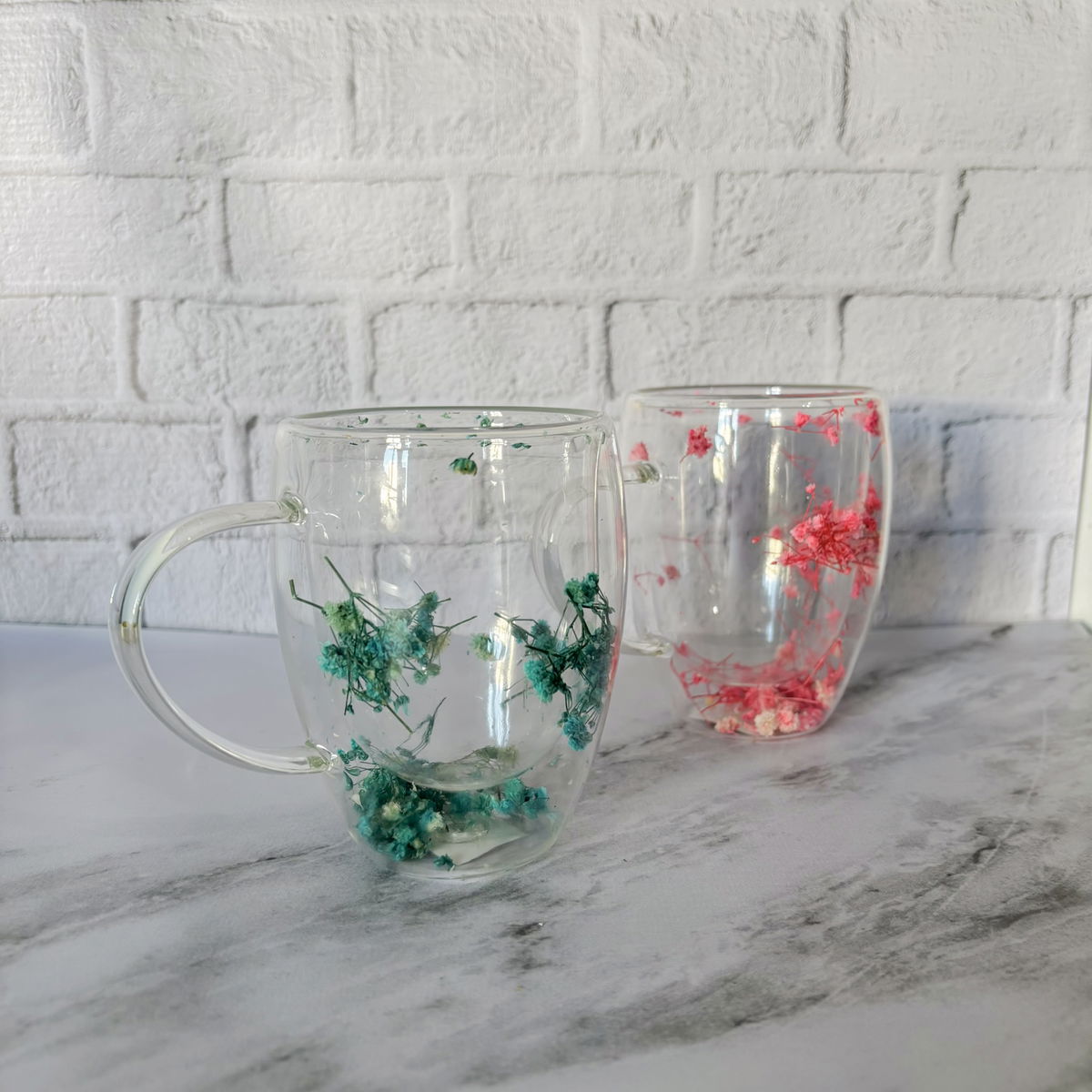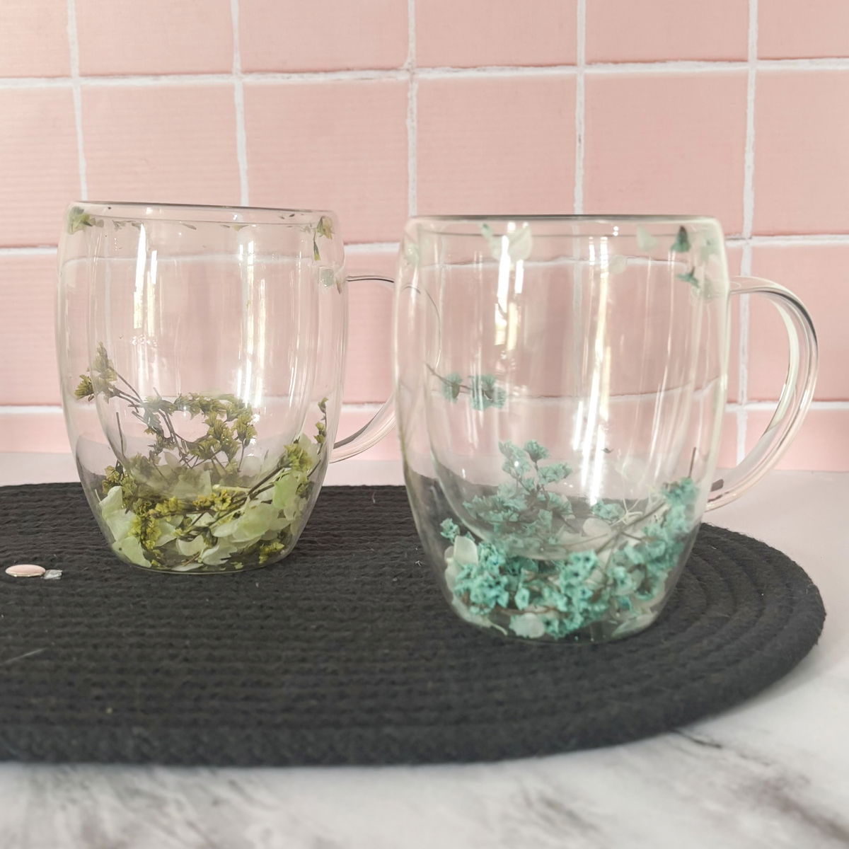 Taza doble vidrio con asa y flores decorativas