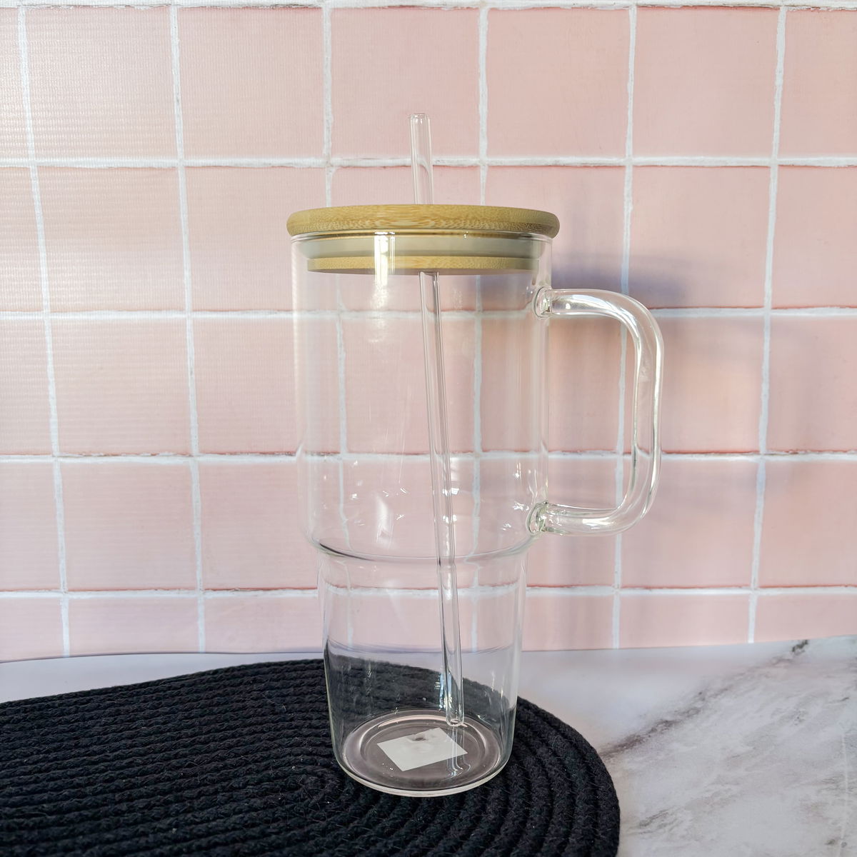 Vaso de 1,3 lt de vidrio con tapa de bamboo y sorbete