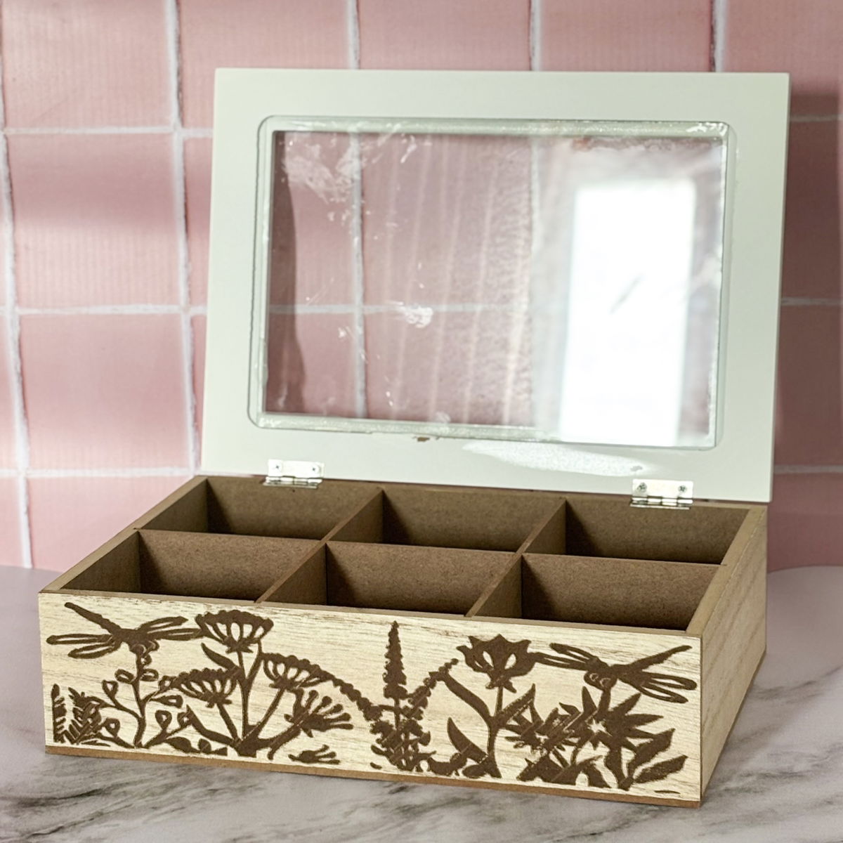 Caja de te de madera, con visor de vidrio. Posee 6 divisiones.