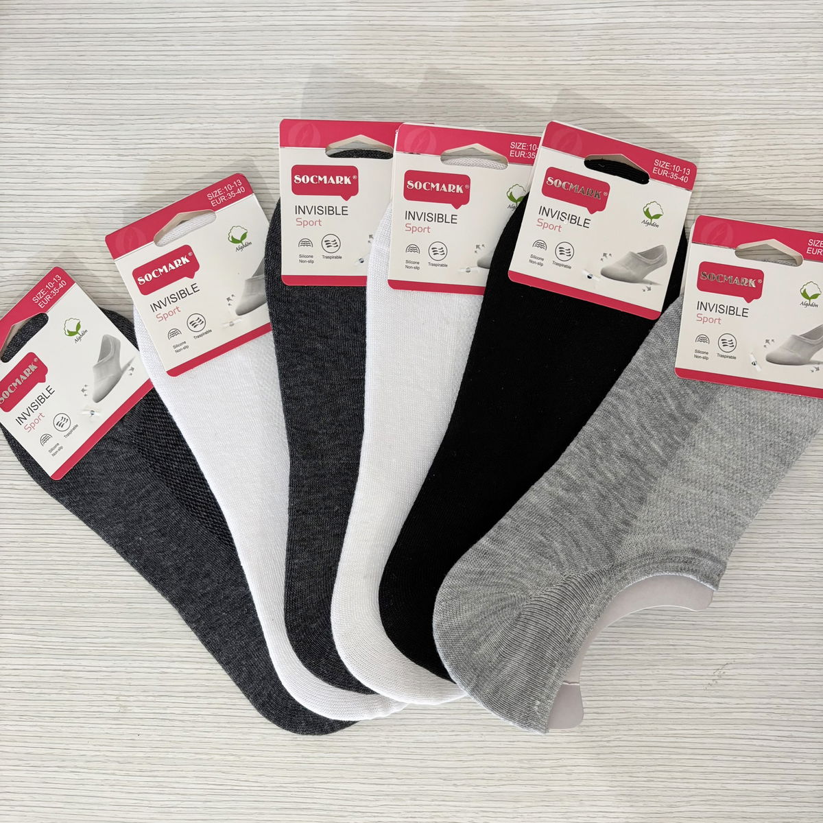 Incluye media docena de medias invisibles colores surtidos entre negros, blancos y grises.