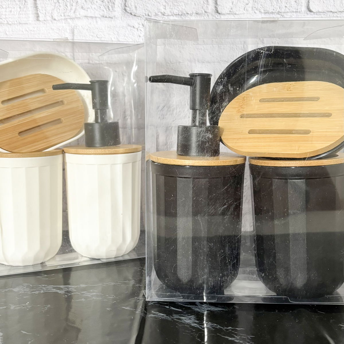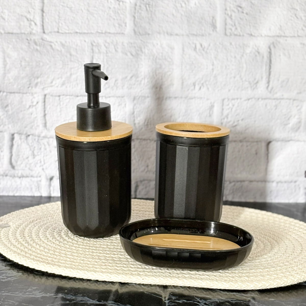Incluye una jabonera, un dispenser líquido y un portacepillos