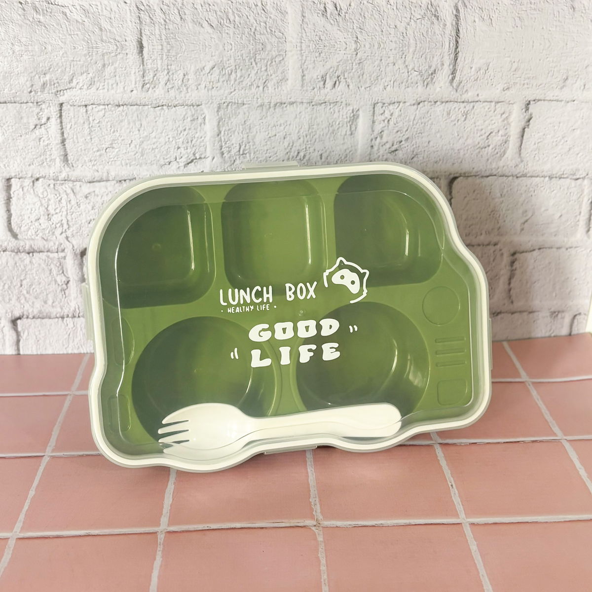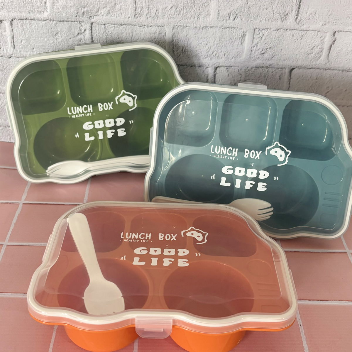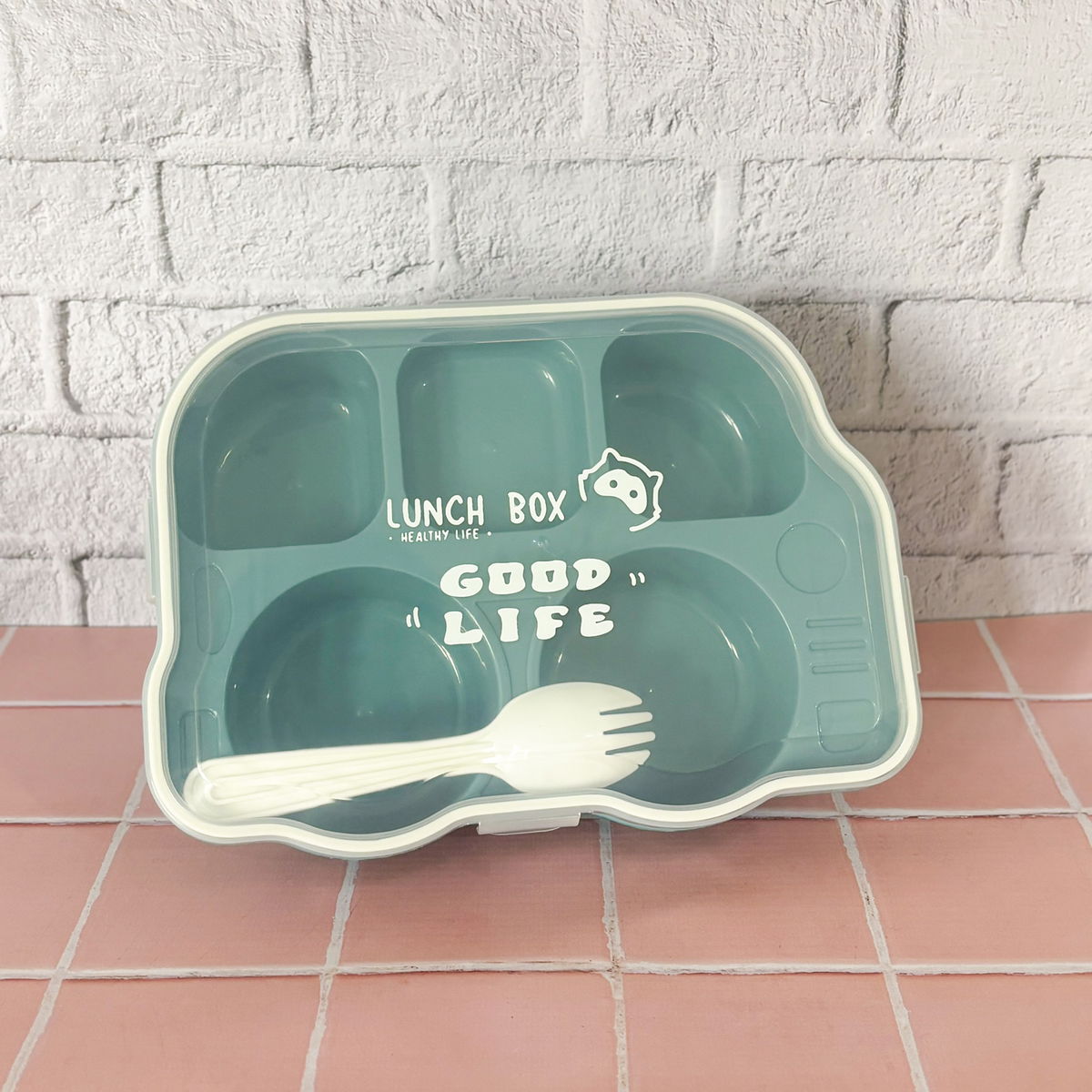 Lunchera con tapa con cierre hermético, contiene 5 divisiones. Incluye tenedor
